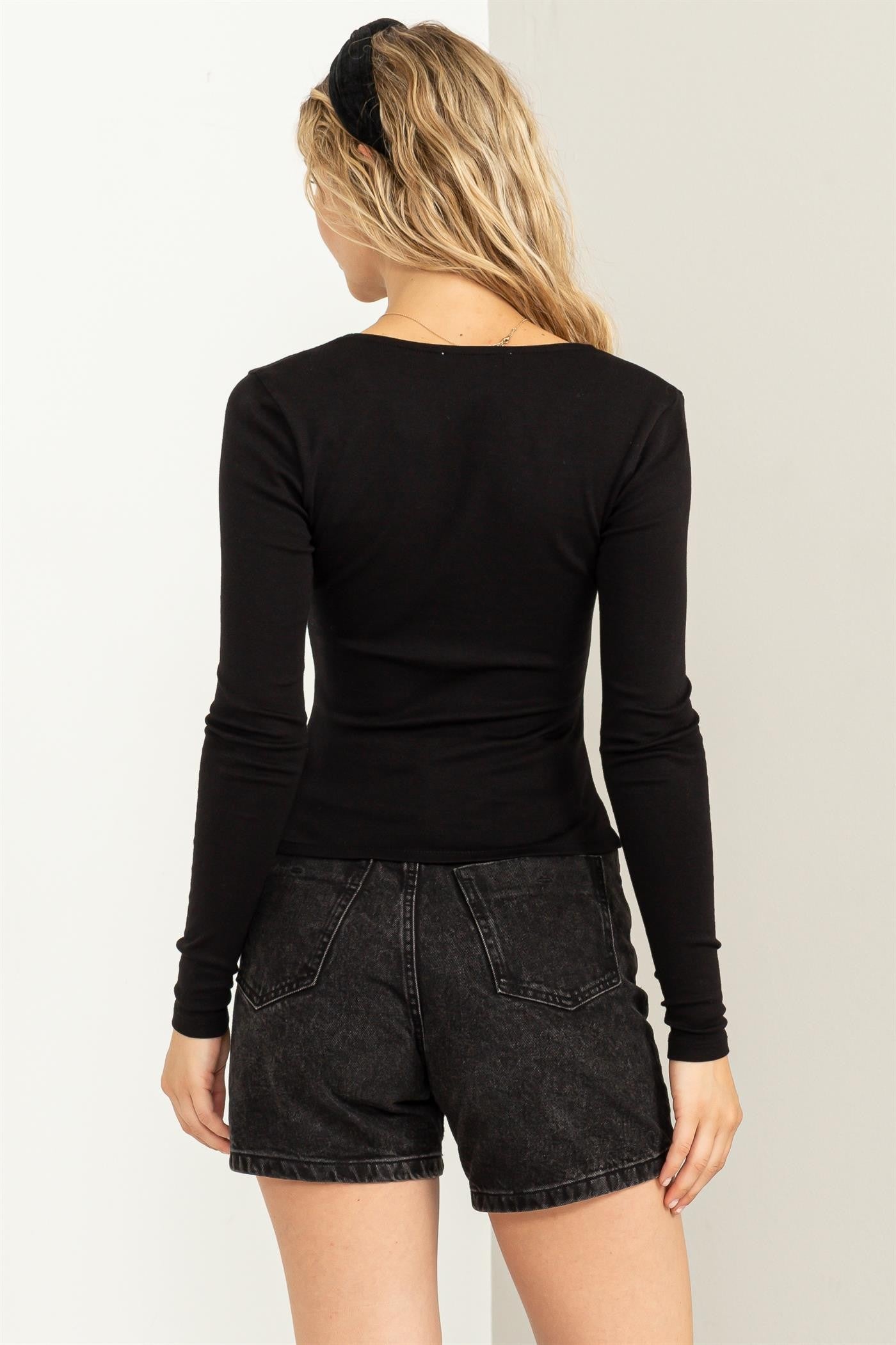YOU IN THIS CHIC TOP! IT'LL BECOME YOUR EVERYDAY FAVORITE, FRAMED WITH A V-NECK AND LONG FITTED SLEEVES. CENTER RUCHING AT THE BODICE CREATES THE ILLUSION OF A CURVIER APPEARANCE.